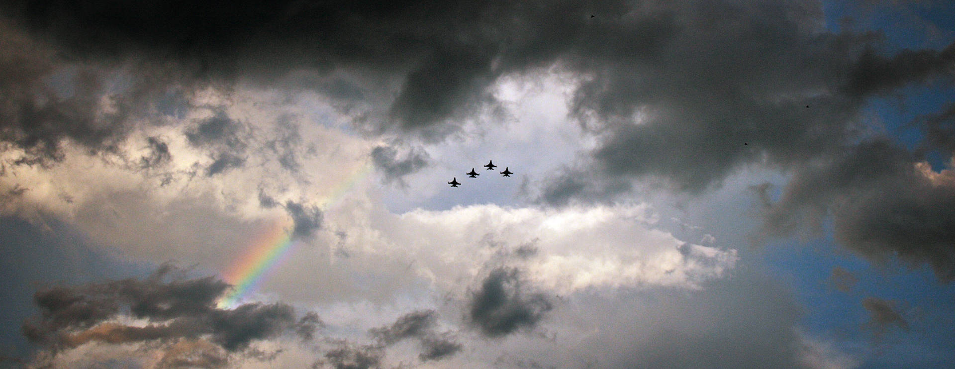 At the conclusion of a July 4 festival in Bartlesville, Oklahoma, a group of jets flew over the main streets of the city, silhouetted against storm clouds and a rainbow, which appeared just before the jets arrived.