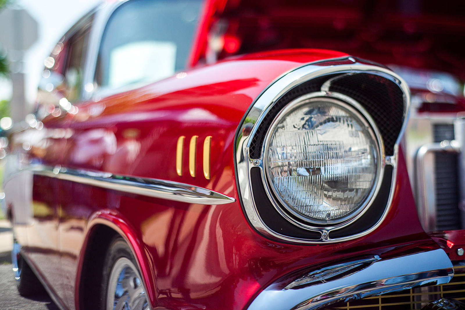 A closeup of a car headlight from one of the classic autos participating in a local classic car show.
