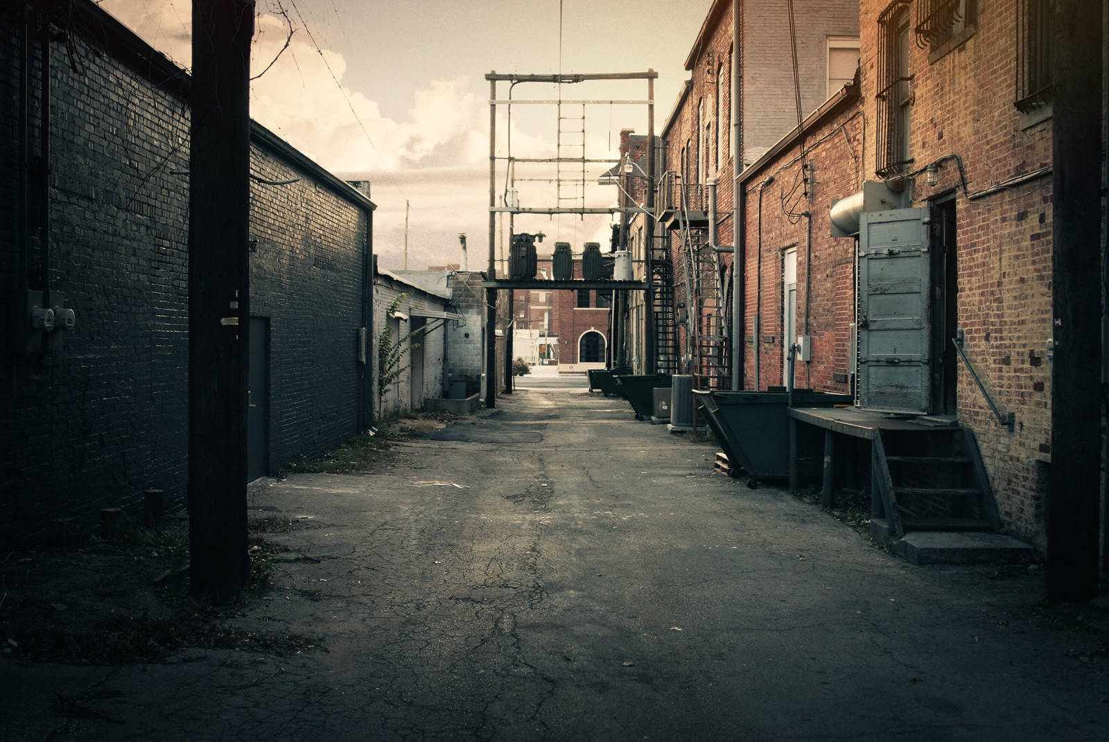 A heavily-edited photograph of the rear entrances of a strip of buildings in a small downtown area.