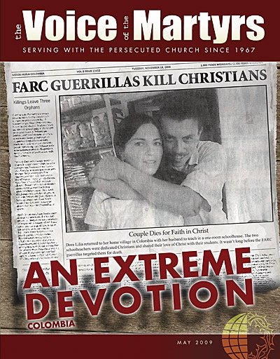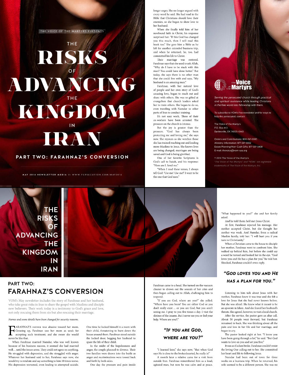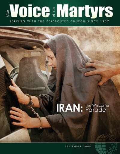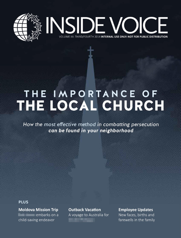 I photographed two VOM staff members re-enacting an abduction story for the cover from the VOM newsletter. The photo was taken in the executive parking lot behind the office building, requiring extensive editing to remove traces of its location from the final version.