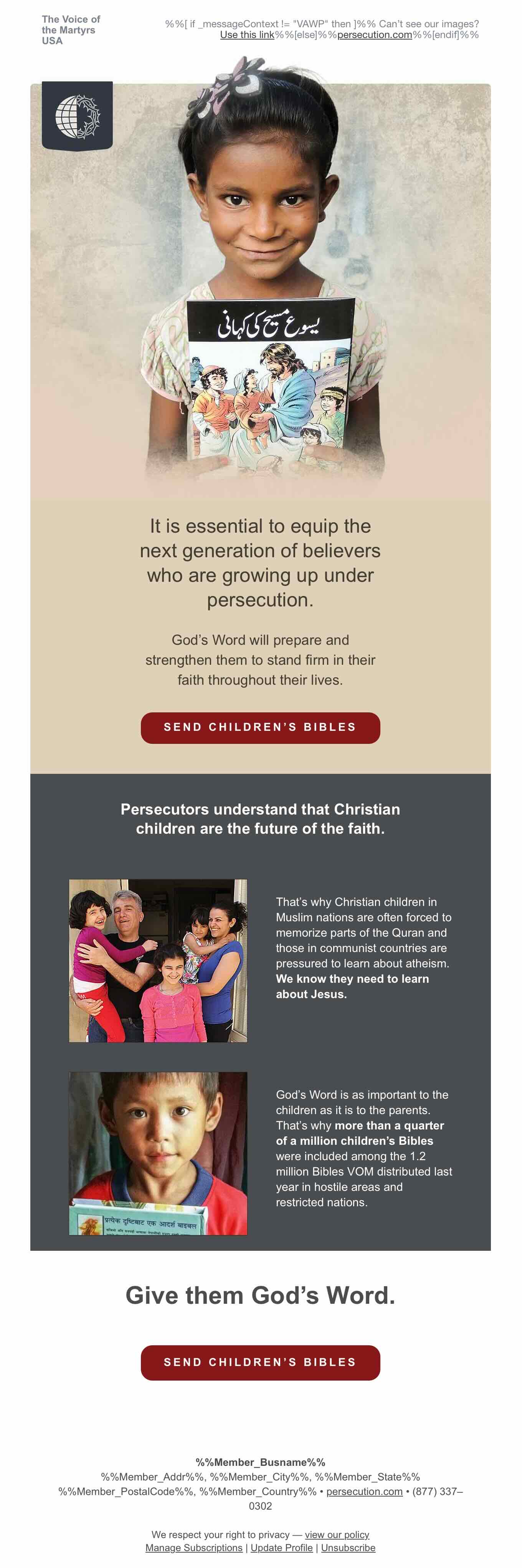 This email was sent to potential donors to encourage them to support paying for religious materials to be sent to children.