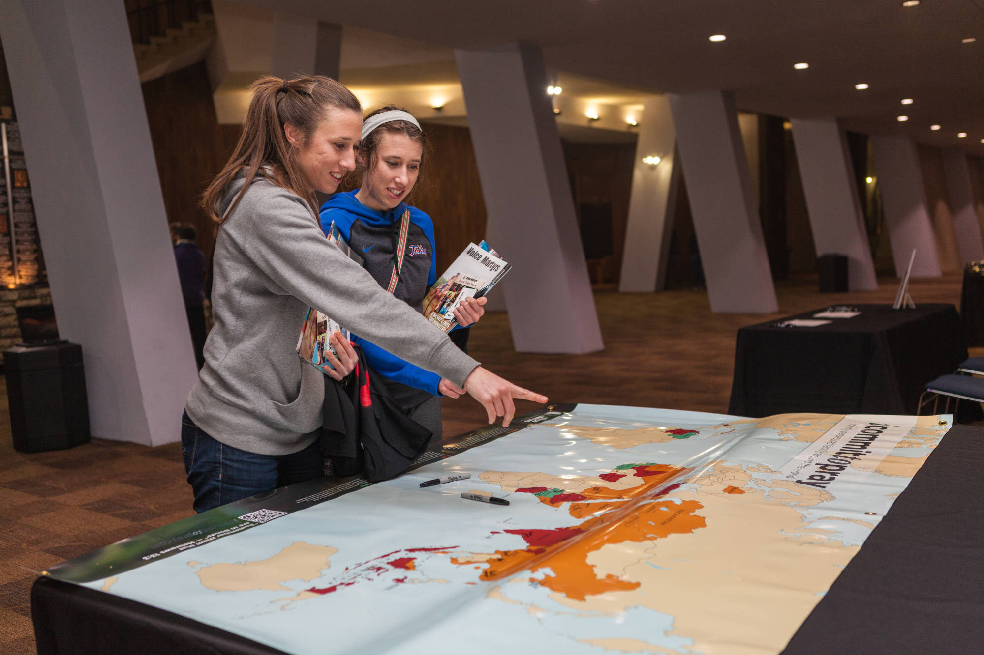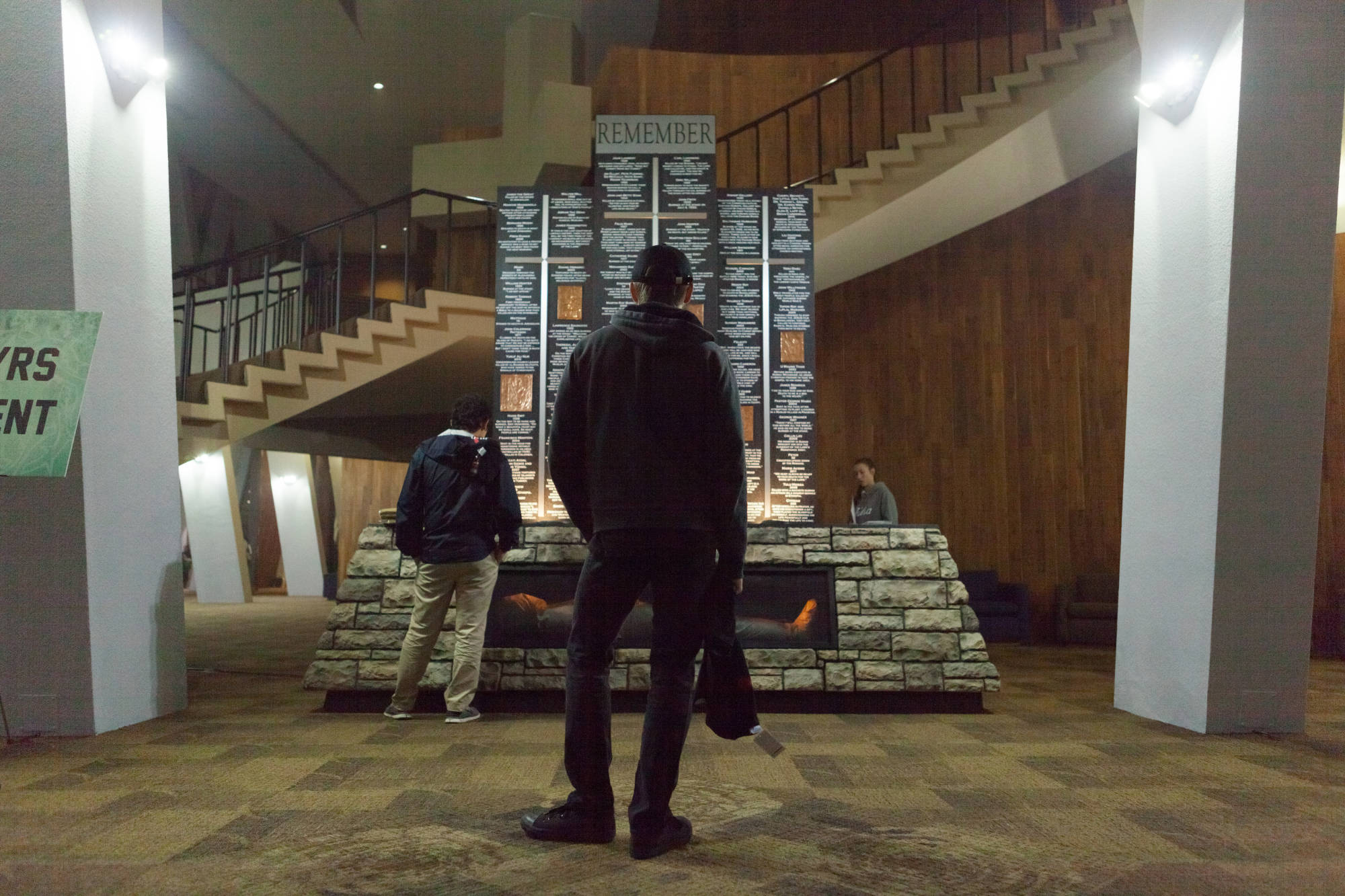 VOM visited a college to campaign for funds and volunteerism, which included erecting a temporary monument to their cause in the foyer.
