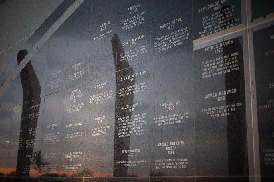 A wall of commemorative plaques bearing the names of people who were claimed to have died for their beliefs.