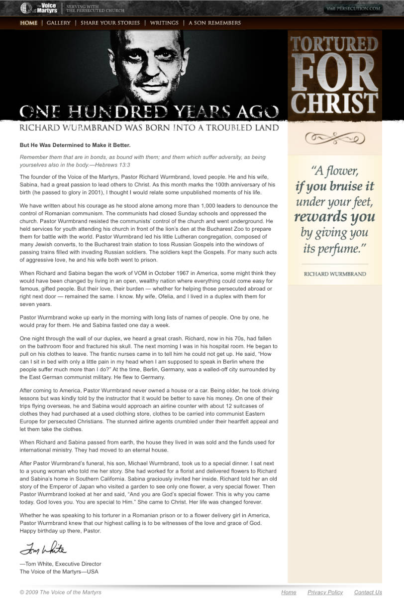 The Centennial Celebration website, eventually renamed to the title of the author’s first book, was a commemorative website to celebrate the founder of the VOM organization. The website was built on WordPress and featured graphic, interactive, and video elements that I generated for the site.